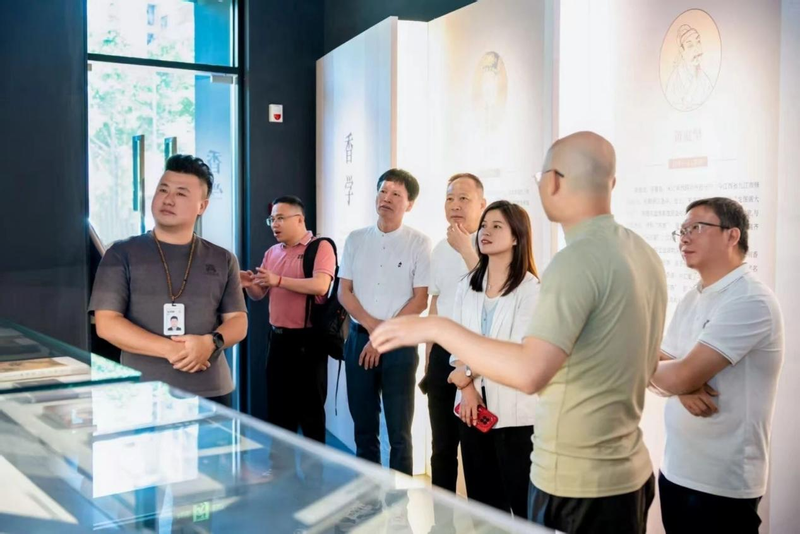 在厦门木之森集团,学院一行参观了产品展厅、沉香博物馆。2002级校友、集团董事长廖木森全面介绍了企业发展历程、核心业务及未来规划,并着重分享了企业运用现代信息技术赋能沉香产业发展的探索与实践,希望双方在人才培养、实习就业、科学研究等方面加强合作,实现校企双向赋能、互惠共赢。陈黎飞副院长与厦门木之森集团林贤明先生共同为“实践教学基地”揭牌。