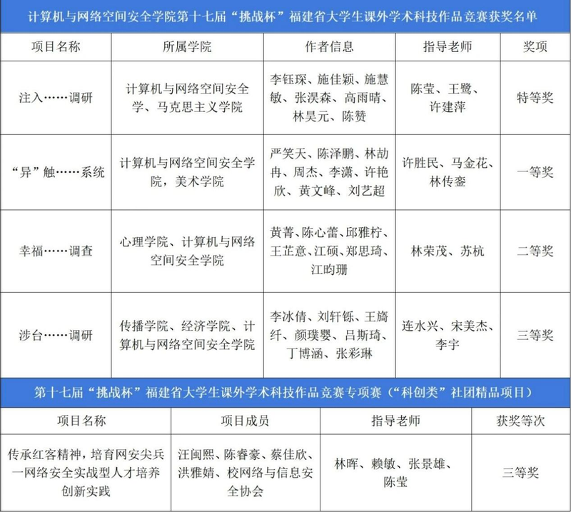 近日,由团省委、省科学技术协会、省教育厅、省社会科学院、省学生联合会共同主办,福州大学、共青团福州市委承办的第十七届挑战杯福建省大学生课外学术科技作品竞赛终审决赛圆满落幕,我院师生参与的多项作品在大赛中脱颖而出,喜获特等奖1项、一等奖1项、二等奖1项、三等奖1项,专项赛三等奖1项,这是学院在该项赛事中取得的最好成绩。