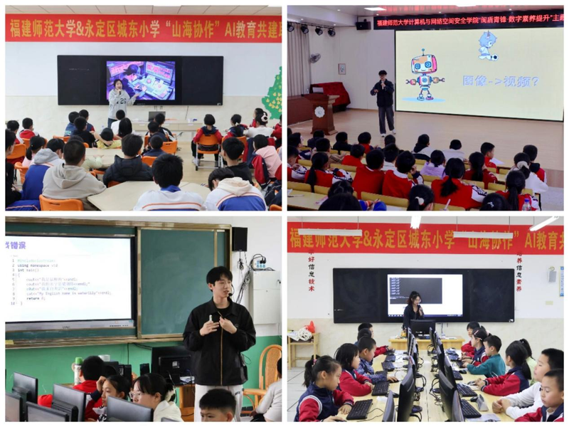 近日,我院“闽盾青锋”网络强国宣讲团联合福建省网络空间安全学会、2024级软件工程4班团支部,走进龙岩市永定区多所中小学,开展数字素养提升主题系列宣讲活动。活动紧扣青少年成长需求,精心设计特色课程,累计开展8场宣讲培训,涉及人工智能、网络安全、计算机基础知识等内容,助力青少年点燃科技梦想,赋能数字素养提升,筑牢校园网络安全防线。