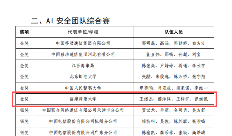 近日,第三届“数信杯”数据安全大赛决赛在江苏南京圆满落幕。由我院网络与信息安全协会王煜杰、游泽洋、王梓江、曾旭帆组成的NISA战队(指导教师:林晖)表现优异,荣获AI安全团队综合赛全国金奖,充分展现了我院在数据安全人才培养方面的突出成效。